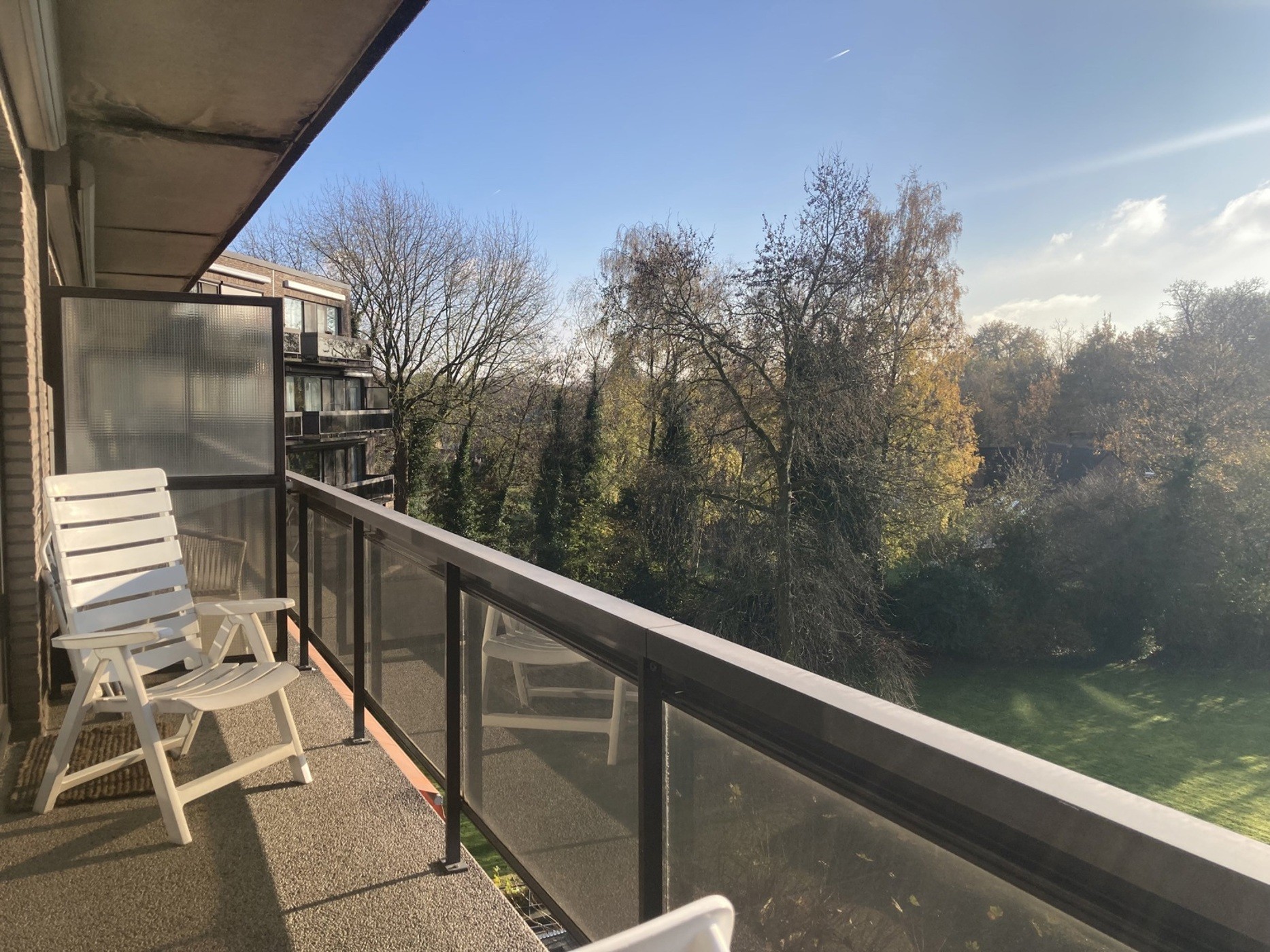 Zowel vanuit de leefruimte als vanuit de slaapkamer heeft men toegang tot het ruime terras met automatische zonnetent.