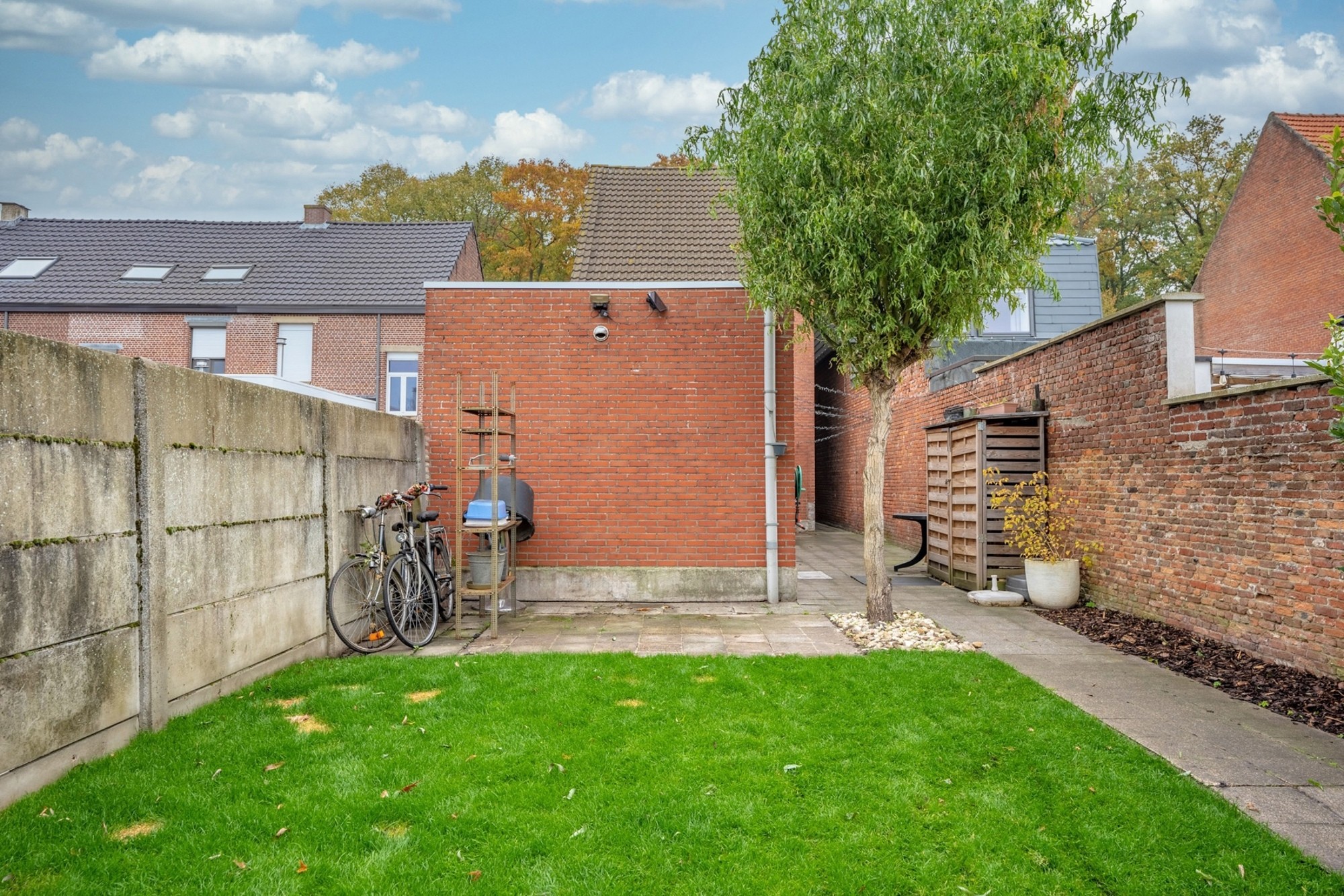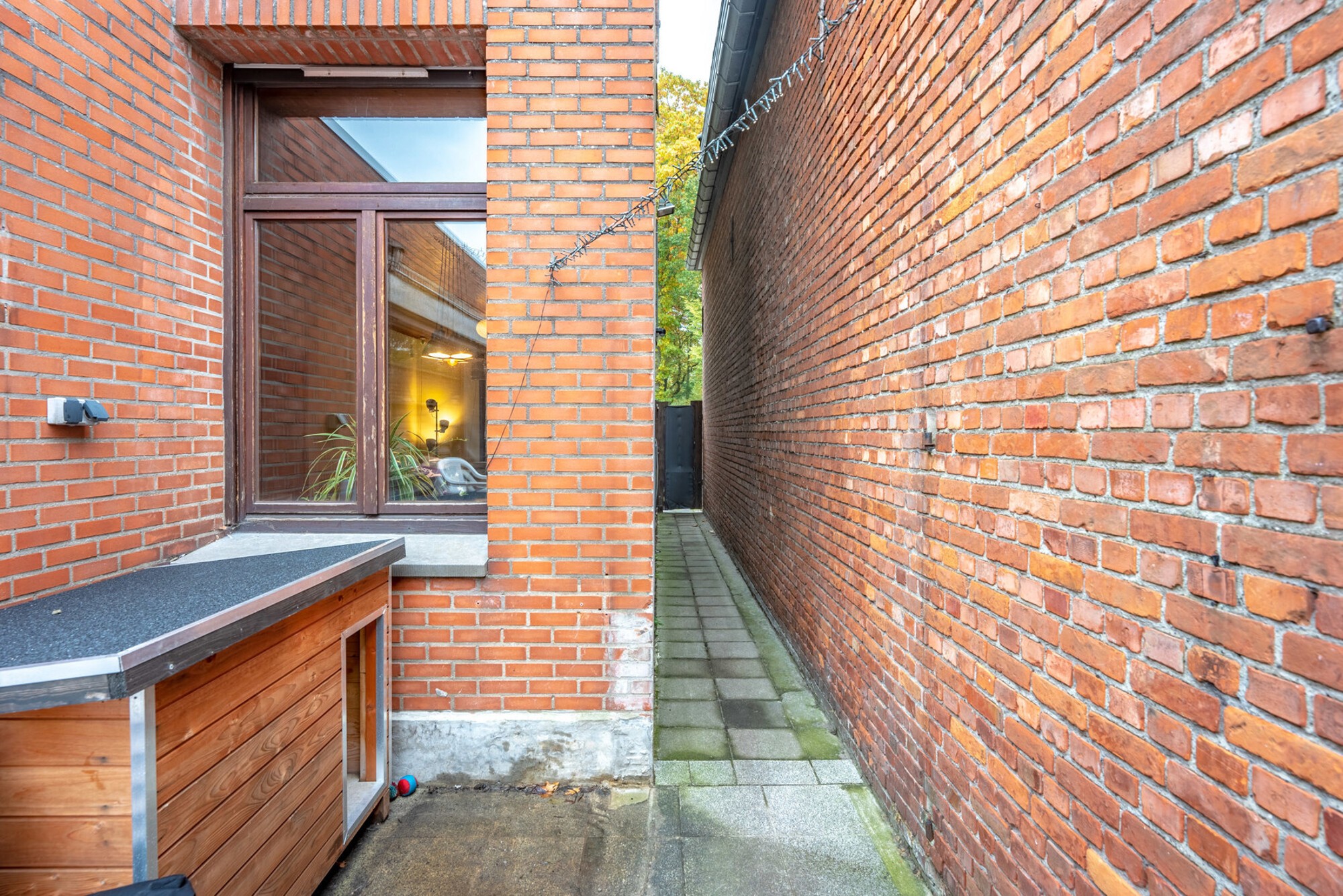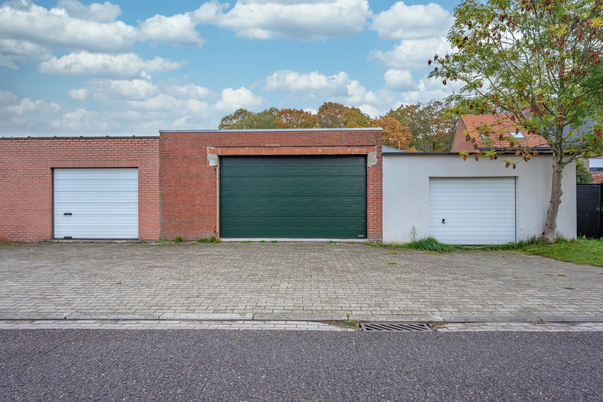 Achter de woning ligt een terras met tuin, waar het heerlijk vertoeven is in alle rust. Achteraan bevindt zich een dubbele garage/magazijn met sectionaalpoort (4m breed- 2,25m hoog) — voldoende ruim voor een kleine bestelwagen of extra opslag.