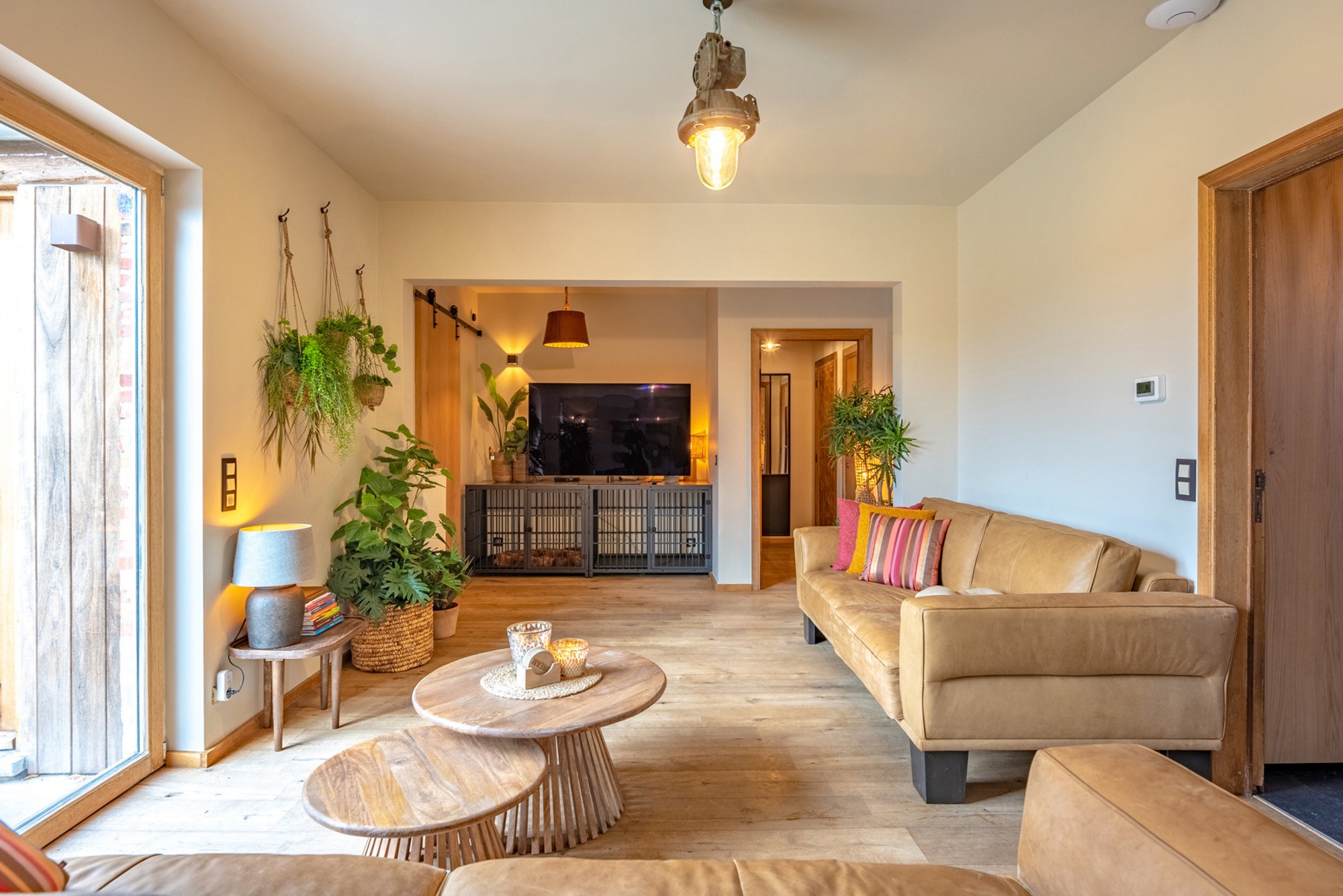 - Living op parketvloer met airconditioning, lamellen op maat en elektrische screens, zicht op en toegang tot de tuin