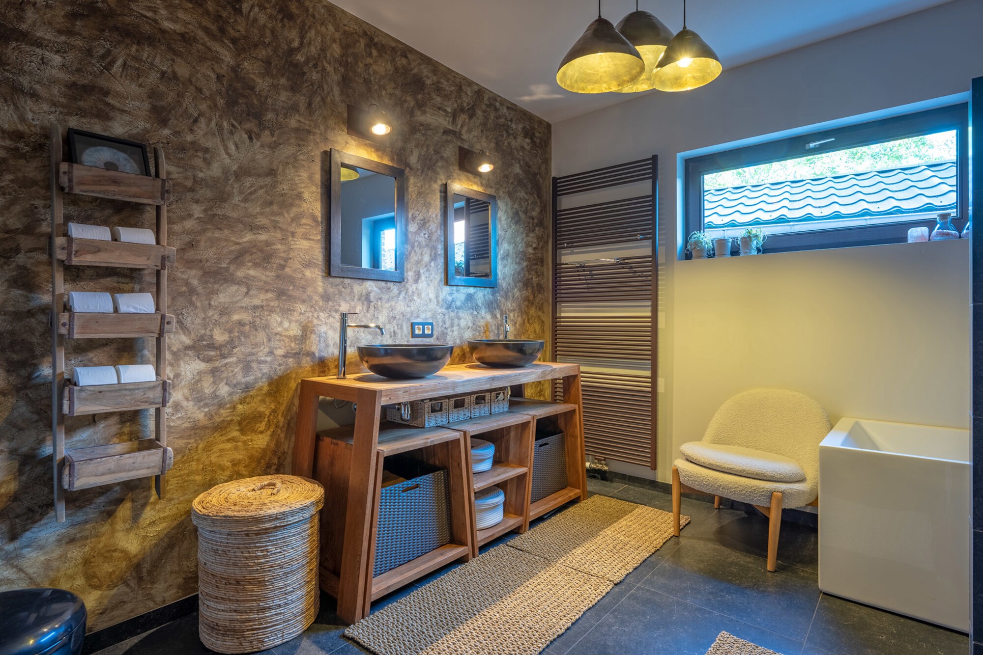 - Badkamer op tegelvloer voorzien van ligbad, inloopdouche, dubbele lavabo, toilet en handdoekverwarmer