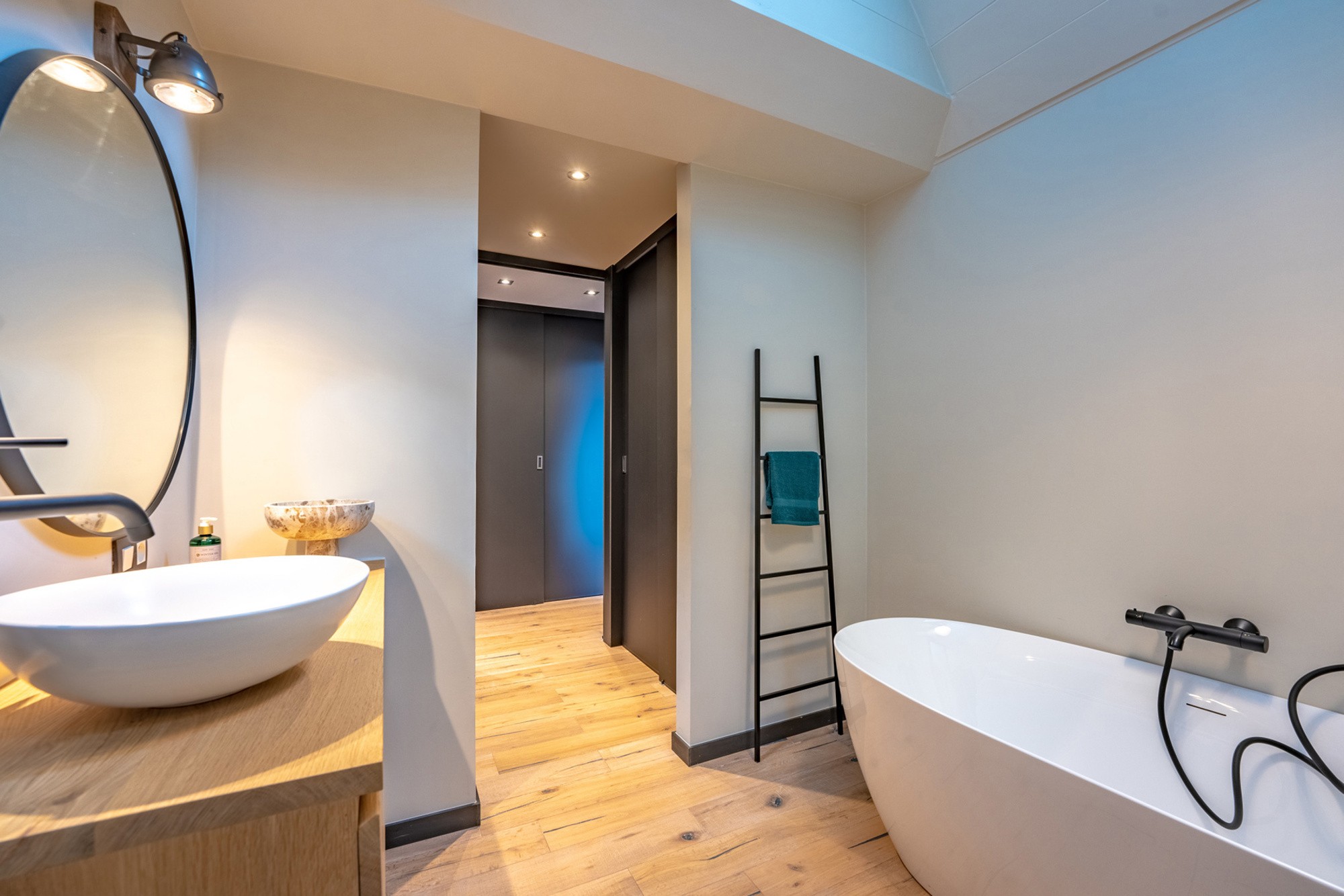 - Dressing op parketvloer met aansluitend een badkamer voorzien van lavabo, ligbad, handdoekverwarmer en elektrische rolluik